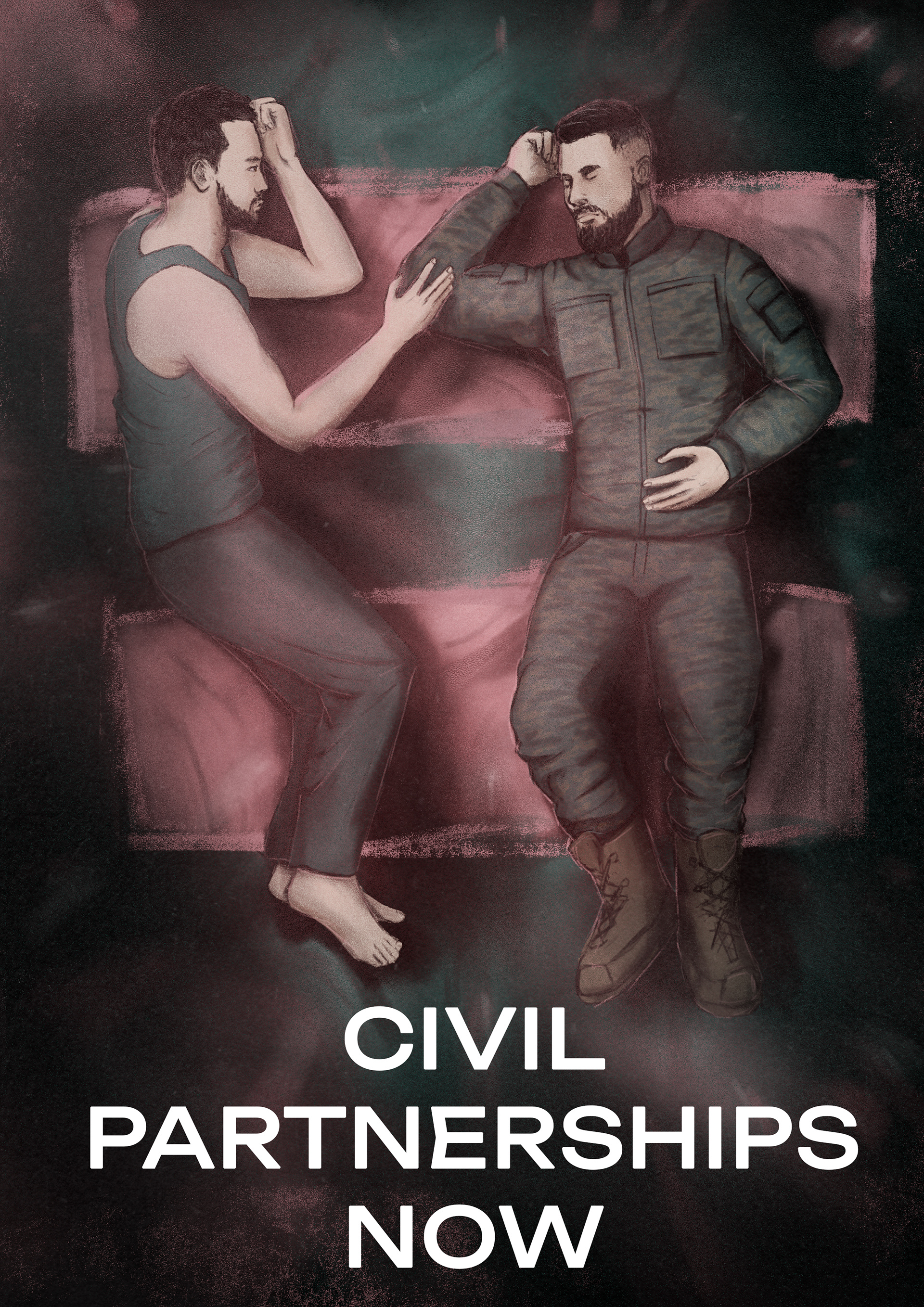 A poster I created to promote civil partnerships for Ukrainian same-sex couples. This is especially urgent during the war, and especially for gay couples.
